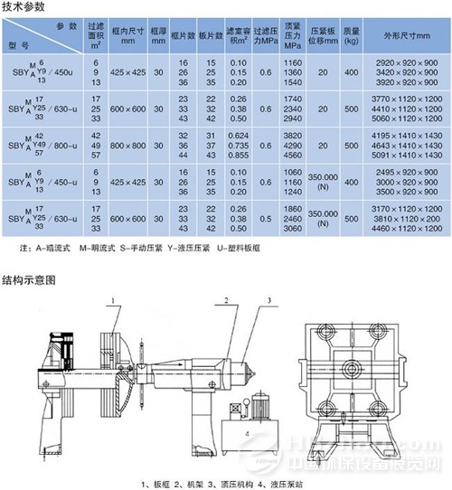 BY型板框壓濾機(jī)分手動(dòng)型和自動(dòng)型兩種,自動(dòng)型具有自動(dòng)壓緊和拉開板框的功能,并且濾室有壓榨隔膜,絞不帶壓榨隔膜的濾餅含水率降低10%左右。