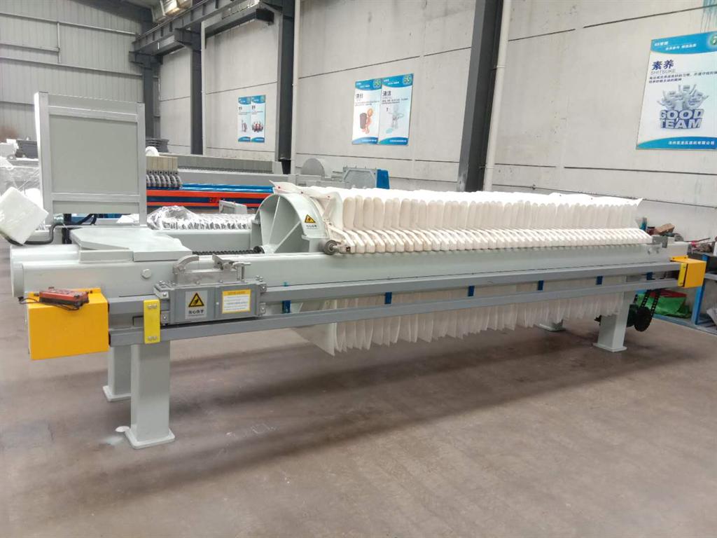 廂式壓濾機(jī)在輸料泵的壓力作用下,將過(guò)濾物輸送到各濾室內(nèi),通過(guò)過(guò)濾介質(zhì)將固體和液體分離。廂式壓濾機(jī)濾室有一塊平板濾板和一塊中空的濾框組成,濾布固定在板框上的,這是早期主要壓濾機(jī)形式,而廂式壓濾機(jī)的濾室是由相鄰兩塊凹陷的濾板構(gòu)成,主要優(yōu)點(diǎn)是_換濾布方便,缺點(diǎn)是效率低、過(guò)濾效果不好、濾板容易壞。在濾布上形成濾渣,慢慢積累形成濾餅。濾液穿過(guò)濾布并沿濾板溝槽流至下方出液孔通道,集中排出。過(guò)濾完畢,可通入清洗滌水洗滌濾渣。洗滌后,有時(shí)還通入壓縮空氣,除去剩余的洗滌液。過(guò)濾結(jié)束后打開(kāi)壓濾機(jī)卸除濾餅,清洗濾布,重新壓緊板濾開(kāi)始下一工作循環(huán)。
